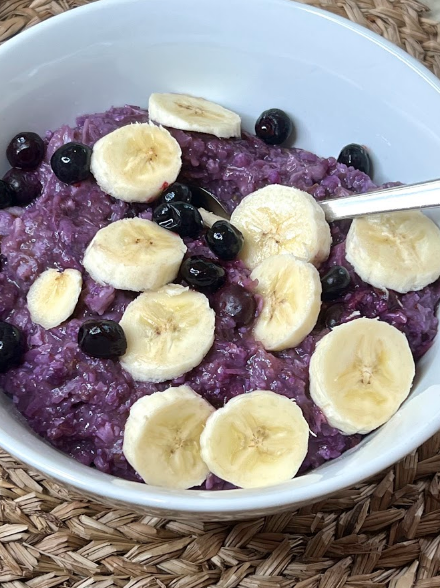 Purple Sweet Potato Soup With Cauliflower Cream and Butternut Croutons